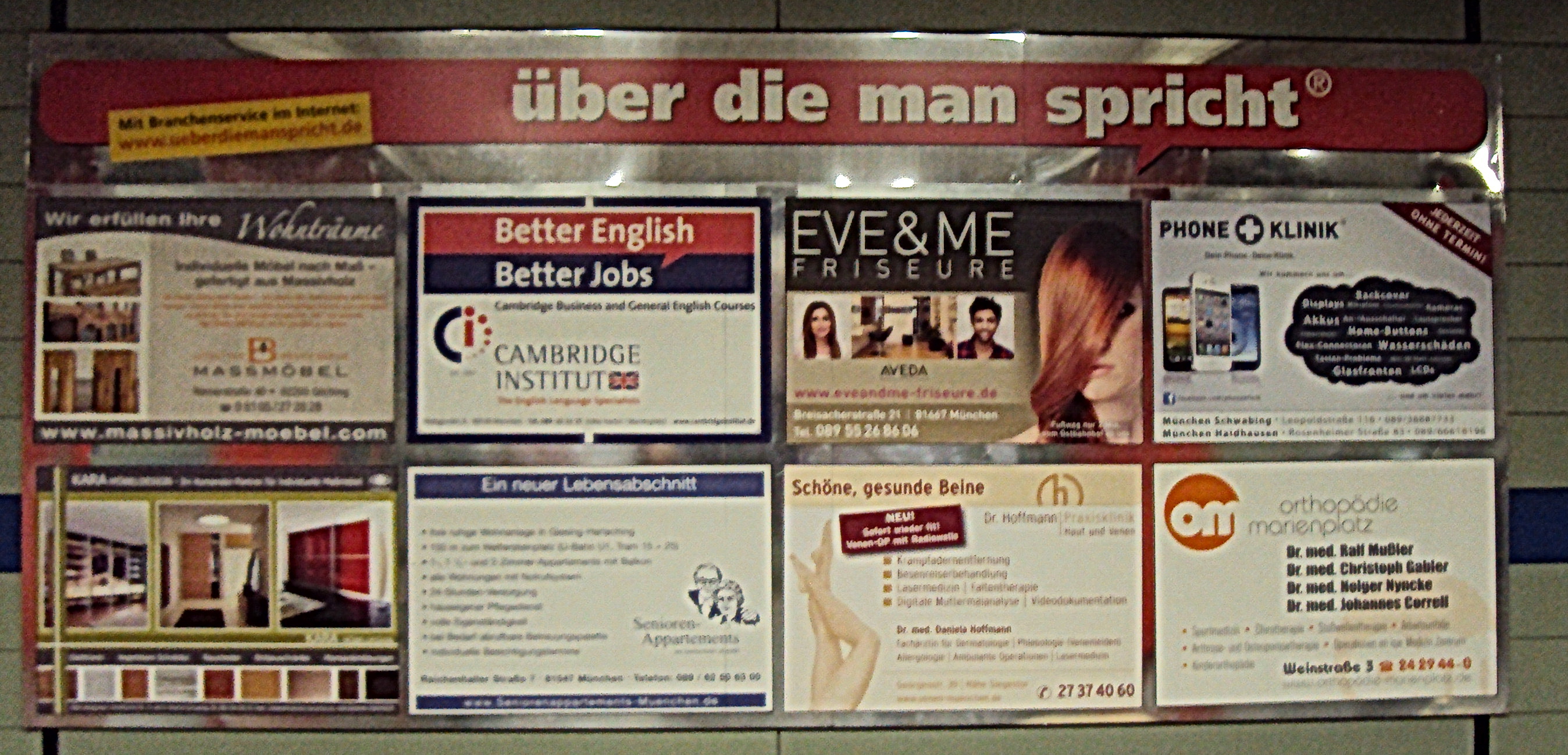 Te reklamy to billboardy, które są podzielone na różne malutkie reklamy prezentujące różnorodne firmy. Myślę, że taka forma reklamy pochodzi z pewnego rodzaju mody na ,,żółte książki” w Niemczech. ,,Gelbe Seiten” (żółte książki) to duża, gruba książka, gdzie znajdują się adresy różnych firm oraz profesjonalistów w danym mieście. Można ją otrzymać każdego kwartału do swojej skrzynki pocztowej, jeśli się ją zamówi w wydawnictwie lub odbierze bezpłatnie na poczcie.